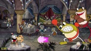Les frères parcourent les Inkwell Isles, combattant les habitants qui ont perdu leur âme au profit du Diable afin d'obtenir leurs contrats. En entrant dans la deuxième île, Sage Samovar les informe qu'ils doivent "faire ce qu'il faut" lorsqu'ils rencontrent à nouveau le Diable. Une fois les contrats obtenus, ils retournent au Casino du Diable, mais son directeur, King Dice, leur barre la route. Il a perdu un pari avec le Diable, vraisemblablement sur la question de savoir si Cuphead et Mugman seraient capables d'accomplir leur tâche, et les oblige à combattre ses propres sbires avant de les affronter directement. Après que les frères ont vaincu King Dice, le Diable exige qu'ils lui remettent les contrats en échange de "rejoindre son équipe". La suite des événements dépend du choix du joueur. Si le joueur décide de le faire, le Diable transforme Cuphead et Mugman en ses serviteurs démoniaques et le jeu se termine. Si le joueur refuse, le Diable devient furieux du refus des frères d'honorer leur accord et les combat lui-même. Cuphead et Mugman triomphent de lui, brûlent les contrats et rentrent chez eux en courant. Apprenant qu'ils n'ont plus rien à craindre du Diable, les anciens débiteurs honorent les frères pour leurs actions héroïques.