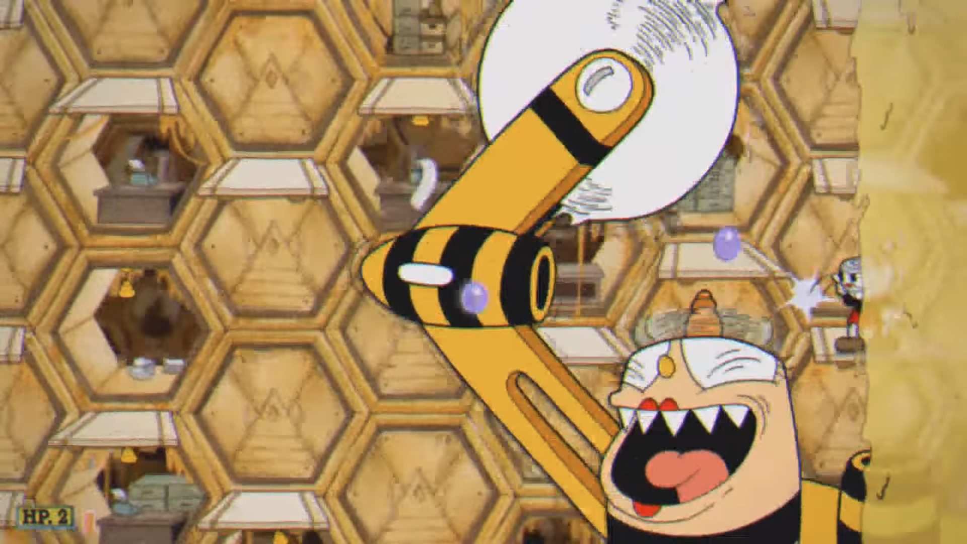 O jogador precisam derrotar a abelha rainha Rumor Honeybottoms e seus funcionários/súditos dentro de sua colmeia/escritório. |