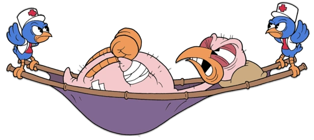 После получения достаточного количества урона, он теряет все перья и выпадает из домика, который разрушается и становится видно его сына, Уилли Уорблса.