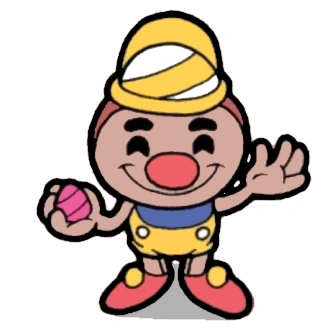 Buster appears on the overworld juggling what appears to be three pink gumdrops. He wears a white and yellow hat, a yellow suit with a blue collar, red shoes with little yellow balls, and most of all, he sports a big goofy clown nose with a satisfied expression on his face.