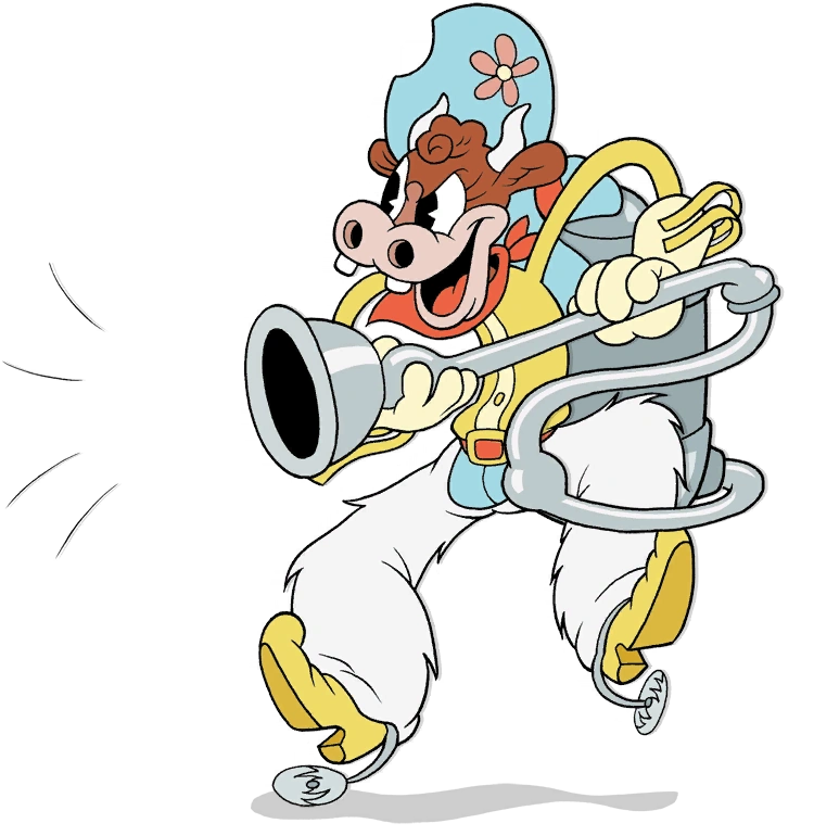 After she takes enough damage, Esther gets a shocked expression as her vacuum malfunctions. The vacuum will then proceed to turn against her and suck her into itself, after which it transforms into an old-fashioned ACME steam cooker. It explodes, and we find out that the cartoon cow has now been processed into sausage links as she looks in a mirror before she realises her mistake and throws it away. She starts running backwards on all fours with her hat on her backside and her clothes ripped, either from the heat of the vacuum's innards or the process of turning her body into sausage links. Phase 3 then begins. Hitpoints = 833/855/960