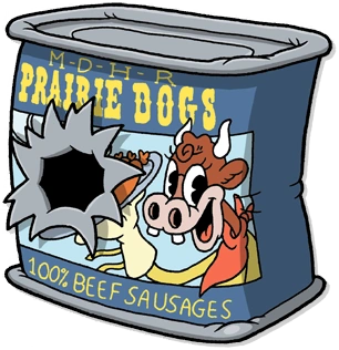 After taking enough damage, Esther will fly into the air and yelp before her body splits into separate sausages. These sausages will fall into a levitating tin can labelled "Prairie Dogs" that contains a picture where Esther is holding a plate of frankfurters. In Simple Mode, the battle will simply end in this phase as she stays in the air, shocked as her body twitches. Hitpoints = 742/713/800