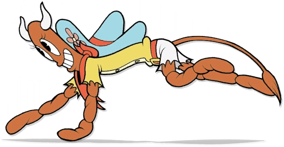 Esther has the usual western apparel for cowboys and cowgirls, while also being a cow in her entirety. She has a puff of curly hair, white horns, and a big snout with two gaping buck teeth. She wears a light blue hat with a pink flower for decoration. She wears a red bandana around her neck, a yellow shirt, pale yellow gloves with tassels, a red belt with a golden buckle, light blue trousers with white woolly chaps, and a pair of yellow boots with spurs. During her third phase, her body is turned into sausage links although her facial features and horns remain intact and her clothes are torn at the arms and legs.