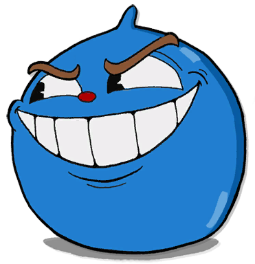 Goopy is a blue slime with a small red nose and a point on top. He is typically limbless, but his intro animation gives him an arm with a white glove on his hand. During Phase 2, Goopy grows twice his normal size and gains a pair of thick and brown eyebrows, with his arm now wearing a red boxing glove. In his final form, he manifests as an angry face on a grey headstone with a cross on top, displaying the term "RIP" (Rest In Peace). Goopy also has eyebrows in his tombstone's inscription.