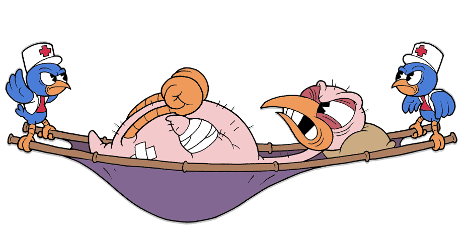 - 垃圾言论 -他的头会变成一个垃圾桶,向玩家吐出垃圾。这些垃圾包括鱼骨头、苹果核和黑色靴子,偶尔会有粉红靴被吐出,其可以被格挡。在专家模式下,他吐垃圾的时间更长。